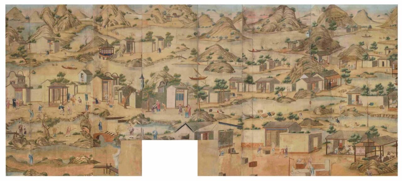 这是目前国内最大的清代外销壁纸(约40平方米),一半留在英国,一半回流中国,见证了清代东西方商贸交流,也是21世纪文物回流的代表性精品。这套壁纸虽然每幅画面题材各不相同,但拼起来是一组完整的反映水乡稻作、茶叶贸易的广州风土人情写实画。